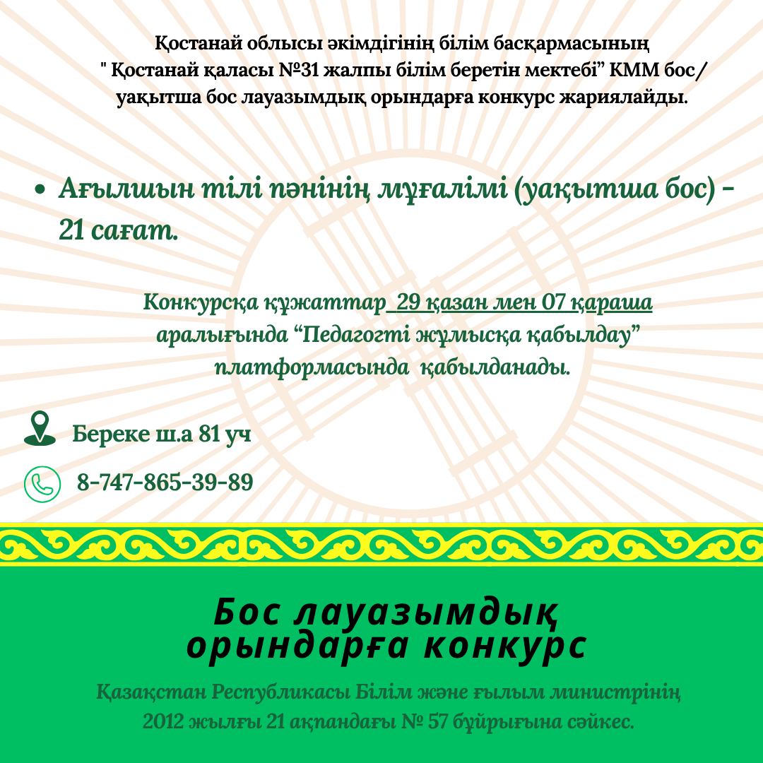 Қостанай облысы әкімдігінің білім басқармасының "Қостанай қаласы №31 жалпы білім беретін мектебі" КММ бос/уақытша бос лауазымдық орынға конкурс жариялайды: